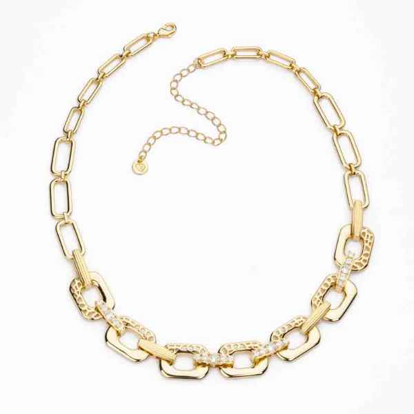 Catena girocollo con elementi rettangolari traforati in brass dorato e inserti in pavè di zirconi clear.