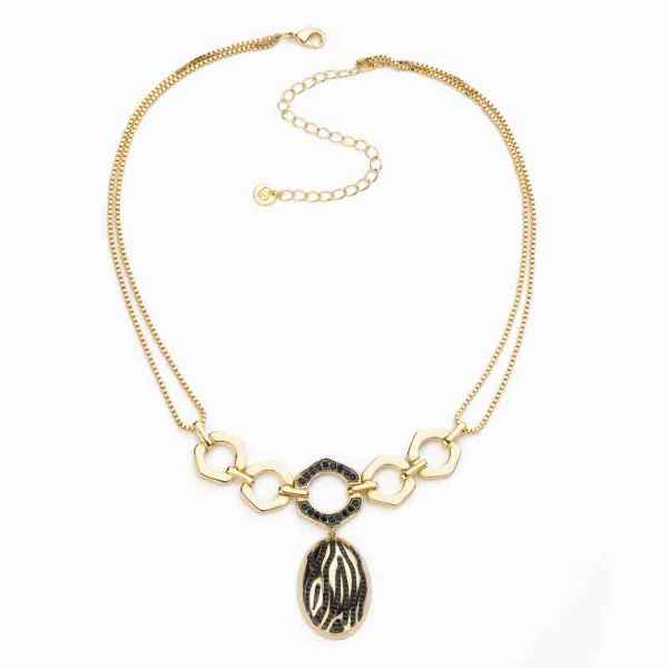 Collana composta da due fili di catena veneziana con esagoni e ovale in brass dorato con pattern zebra in pavè di zirconi black.