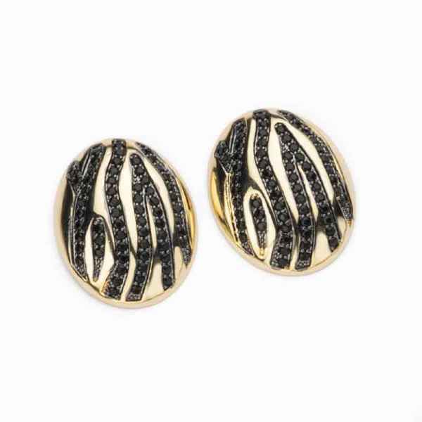 Orecchini con top a forma di cupola ovale in brass dorato con pattern zebra in pavè di zirconi black.